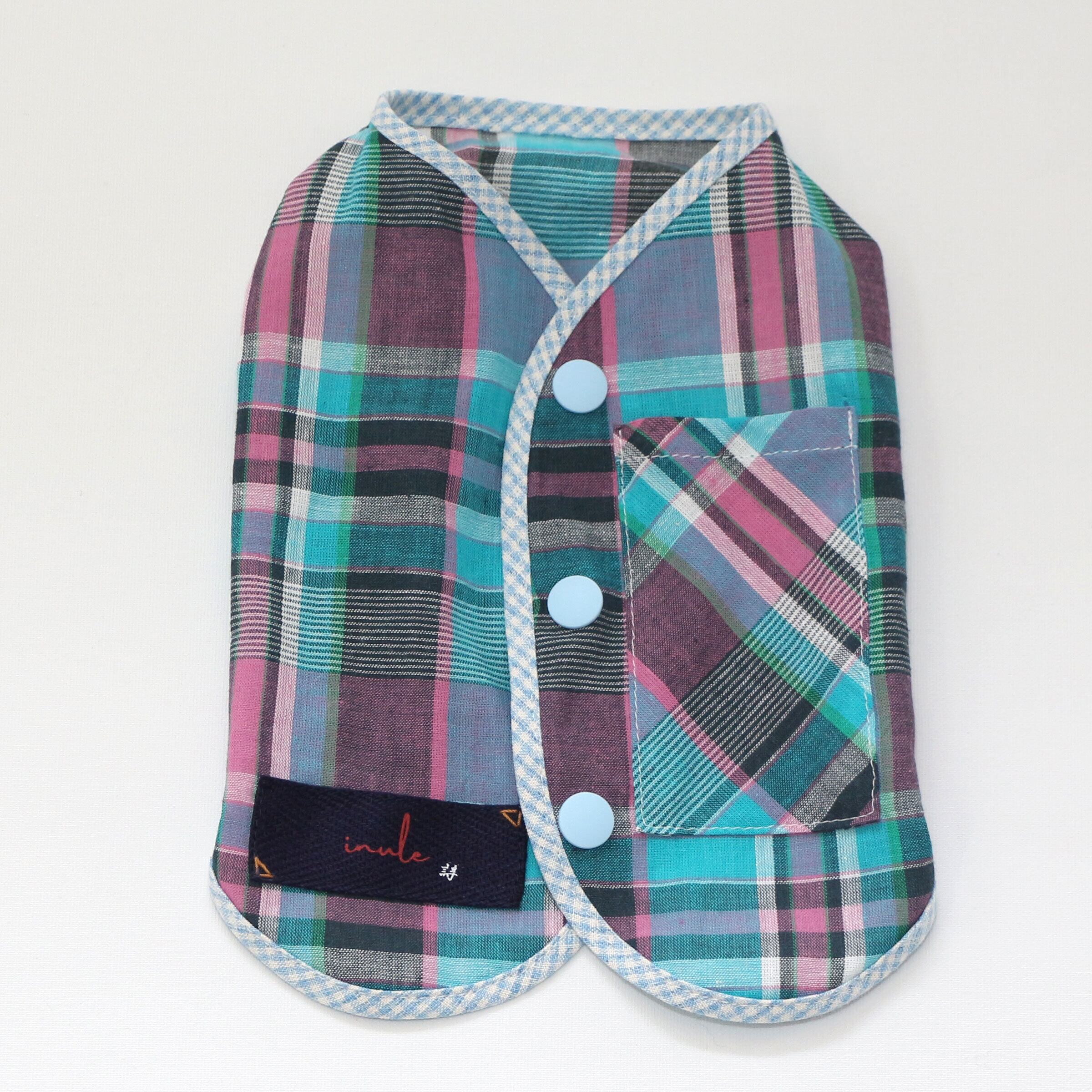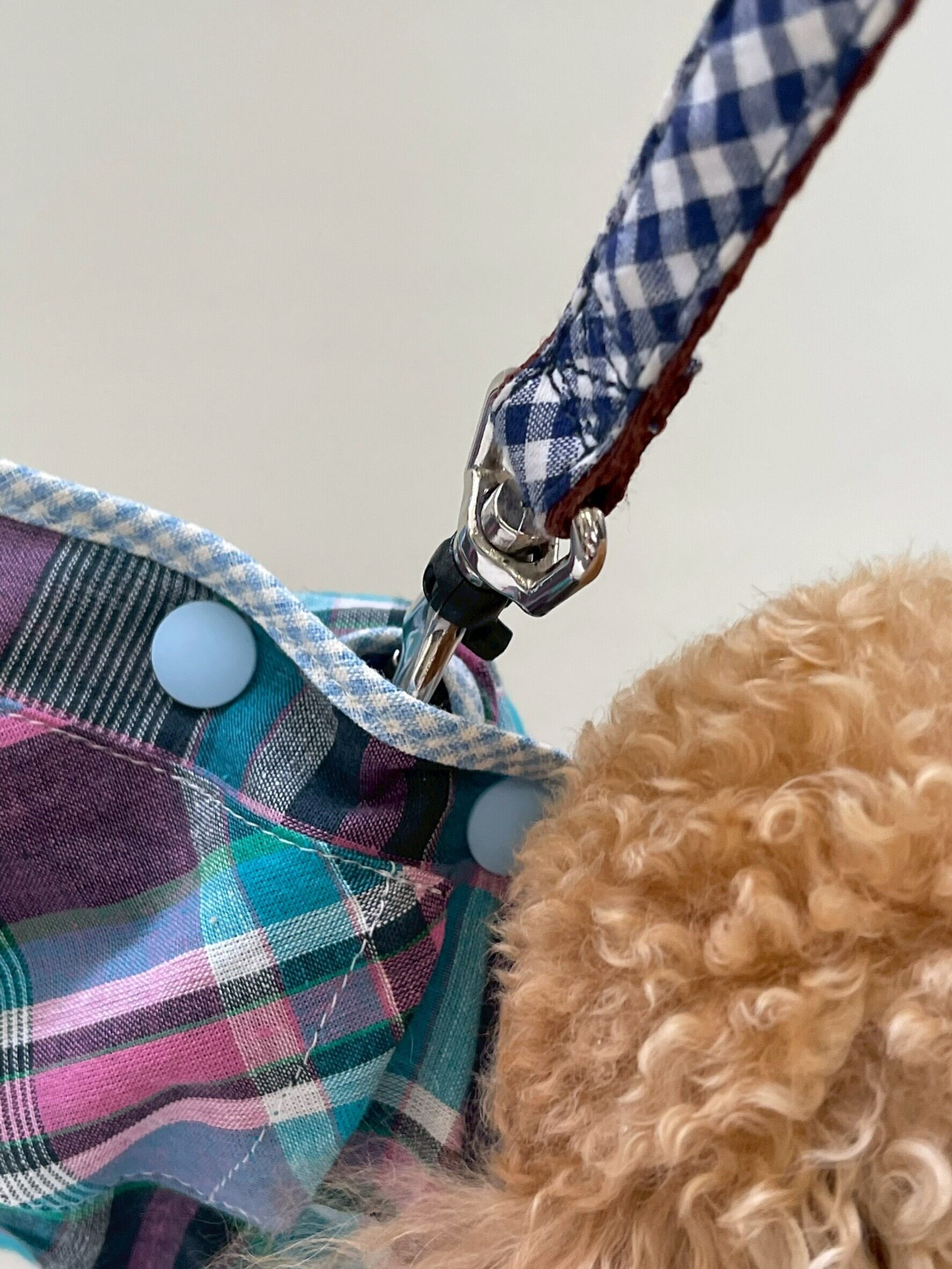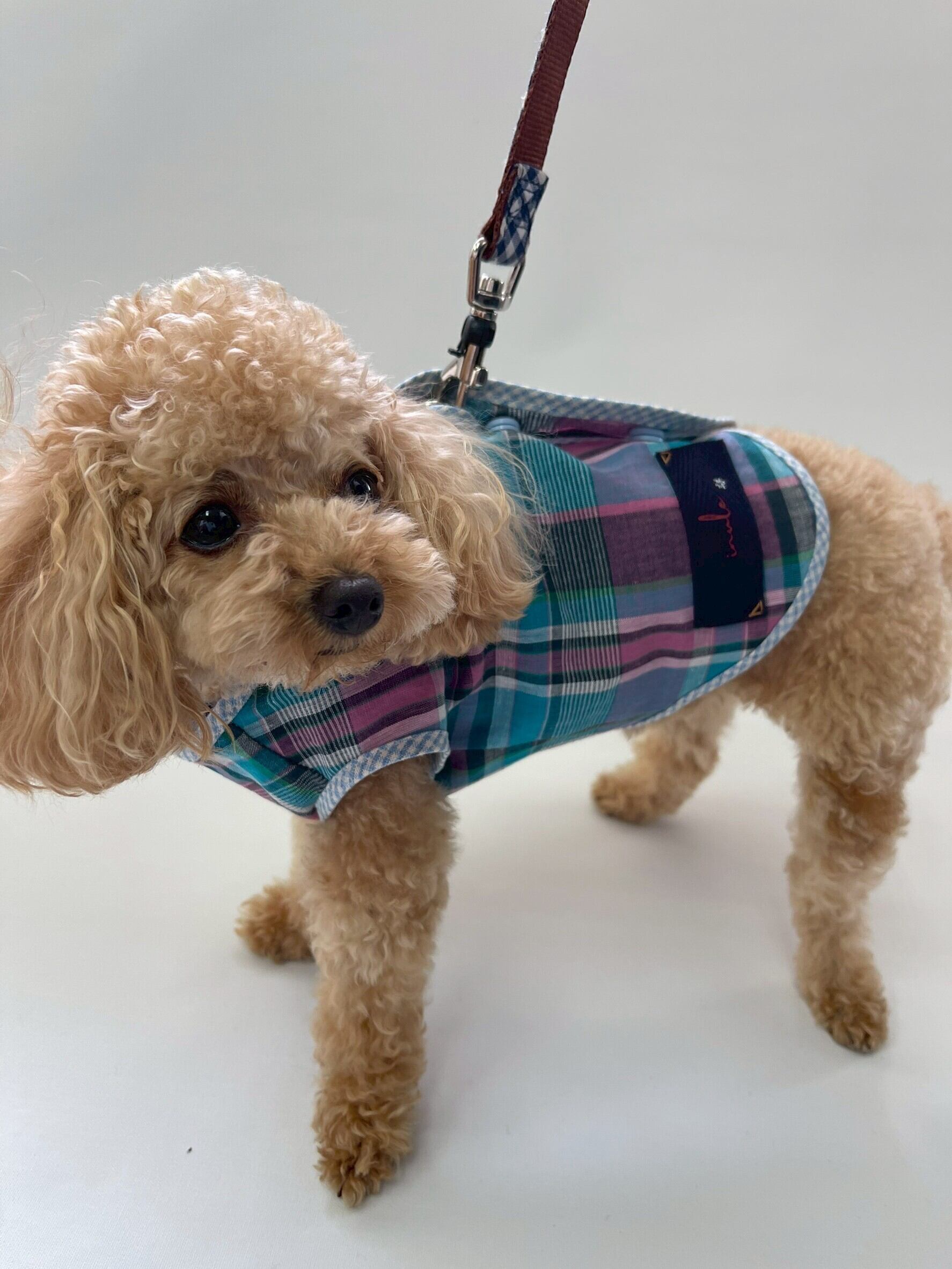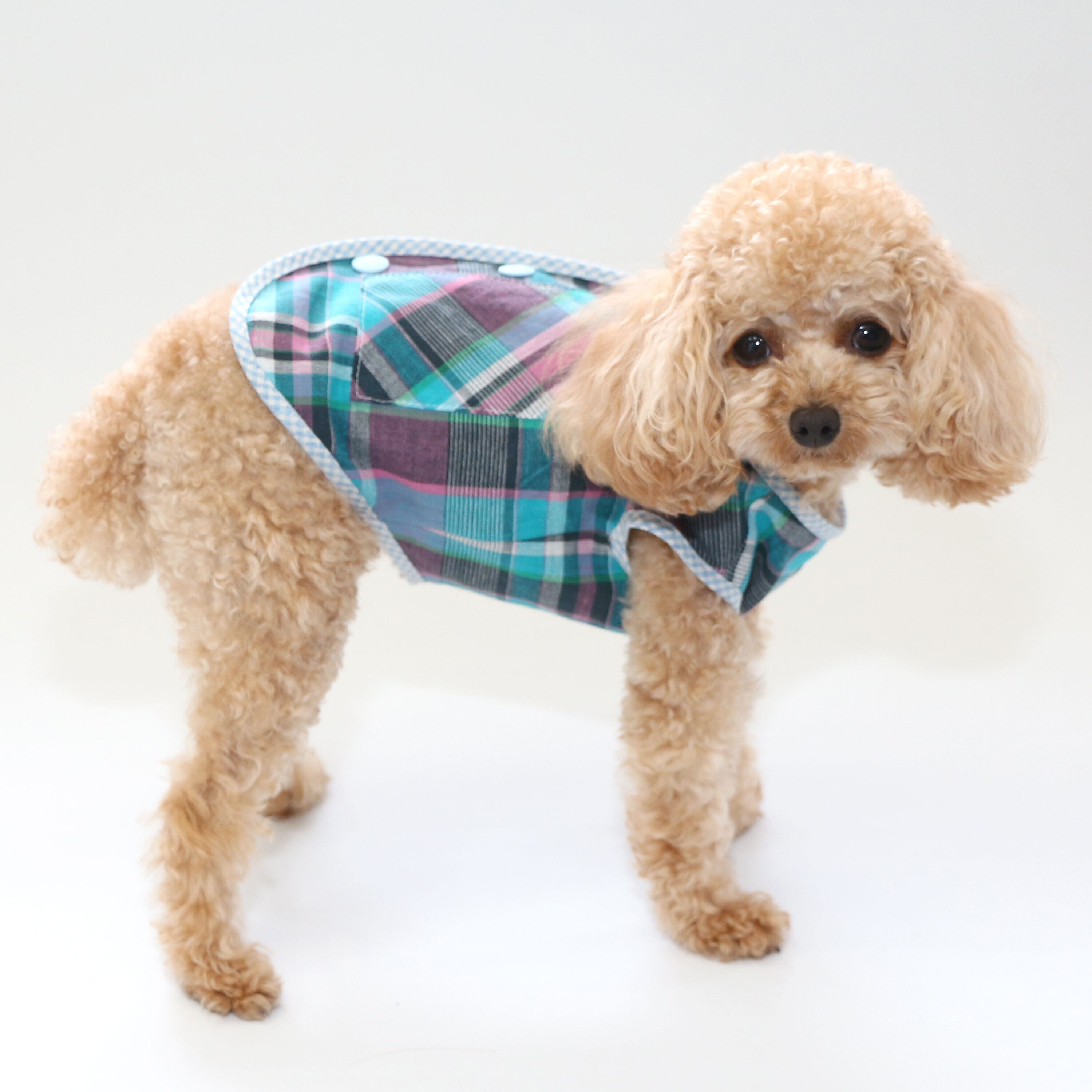 保冷剤等を入れられるポケット付き、背中ボタンなのでハーネスの上から着用してお散歩できます。