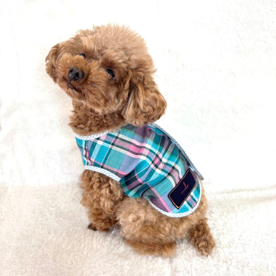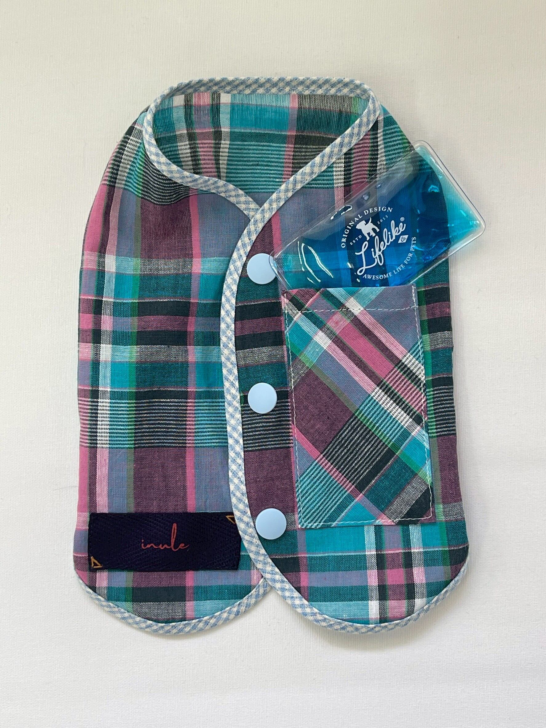 保冷剤等を入れられるポケット付き、背中ボタンなのでハーネスの上から着用してお散歩できます。