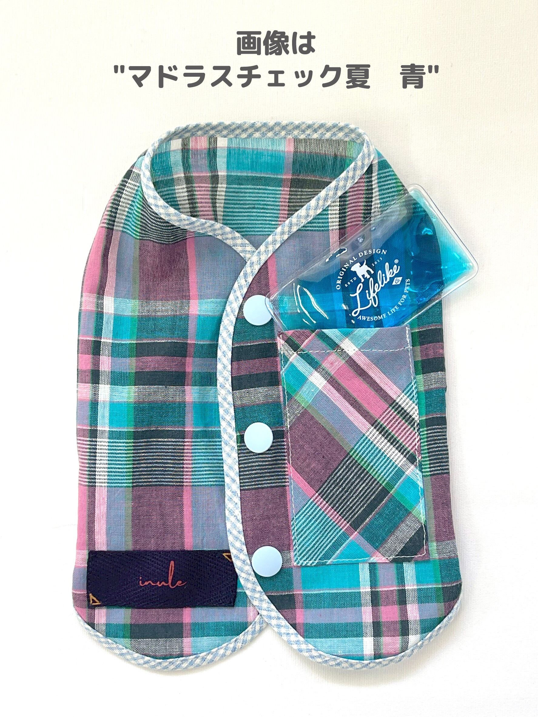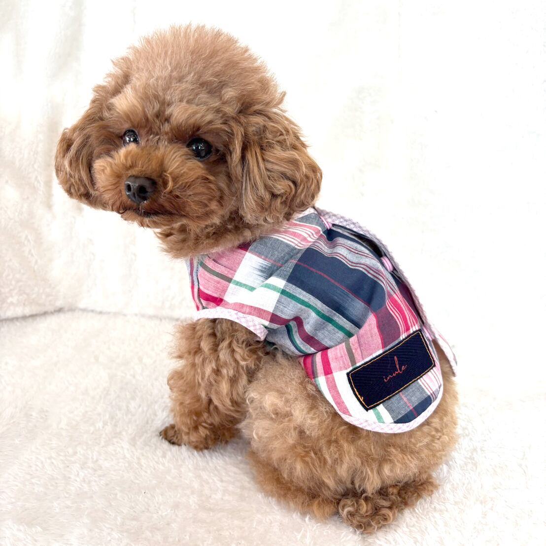 保冷剤等を入れられるポケット付き、背中ボタンなのでハーネスの上から着用してお散歩できます。