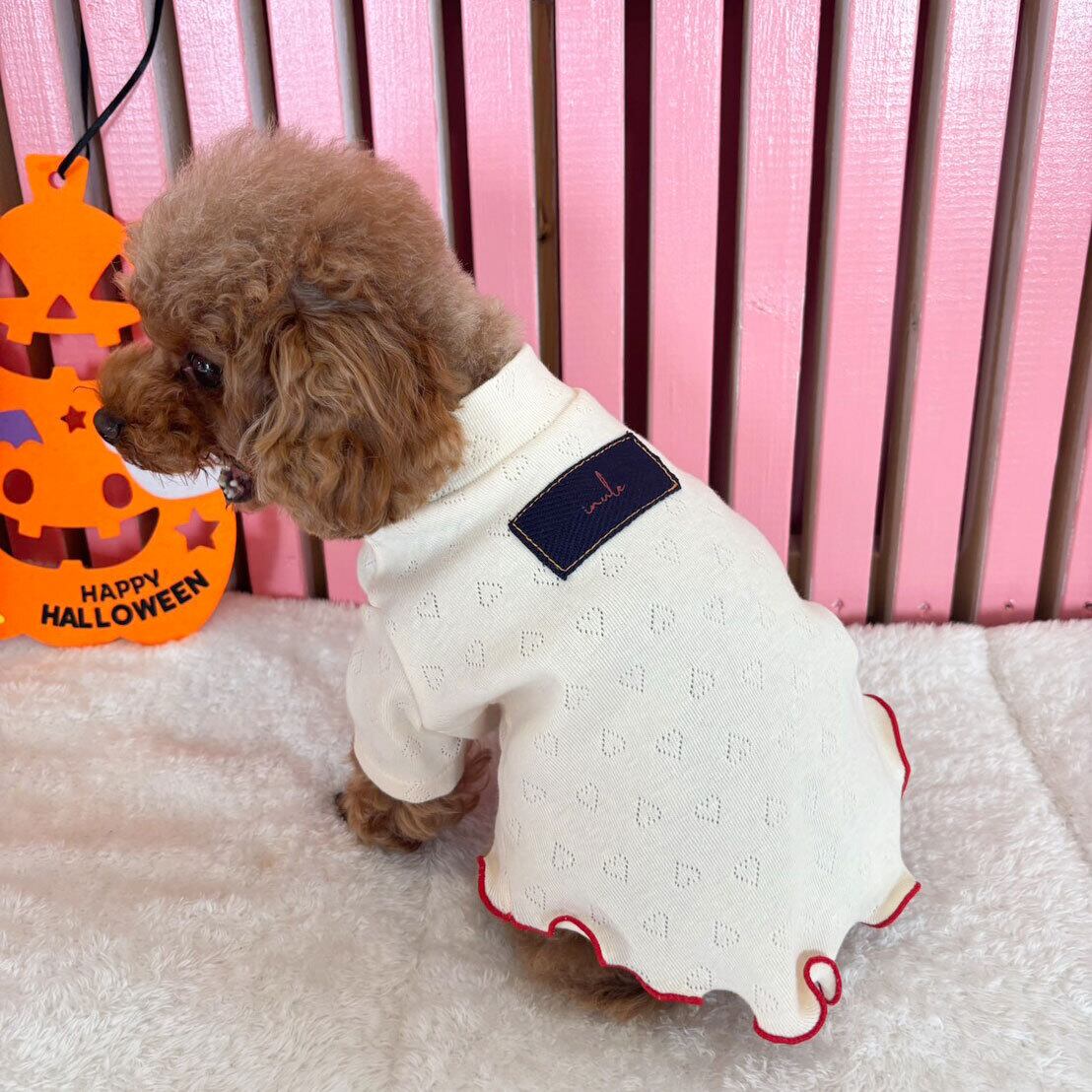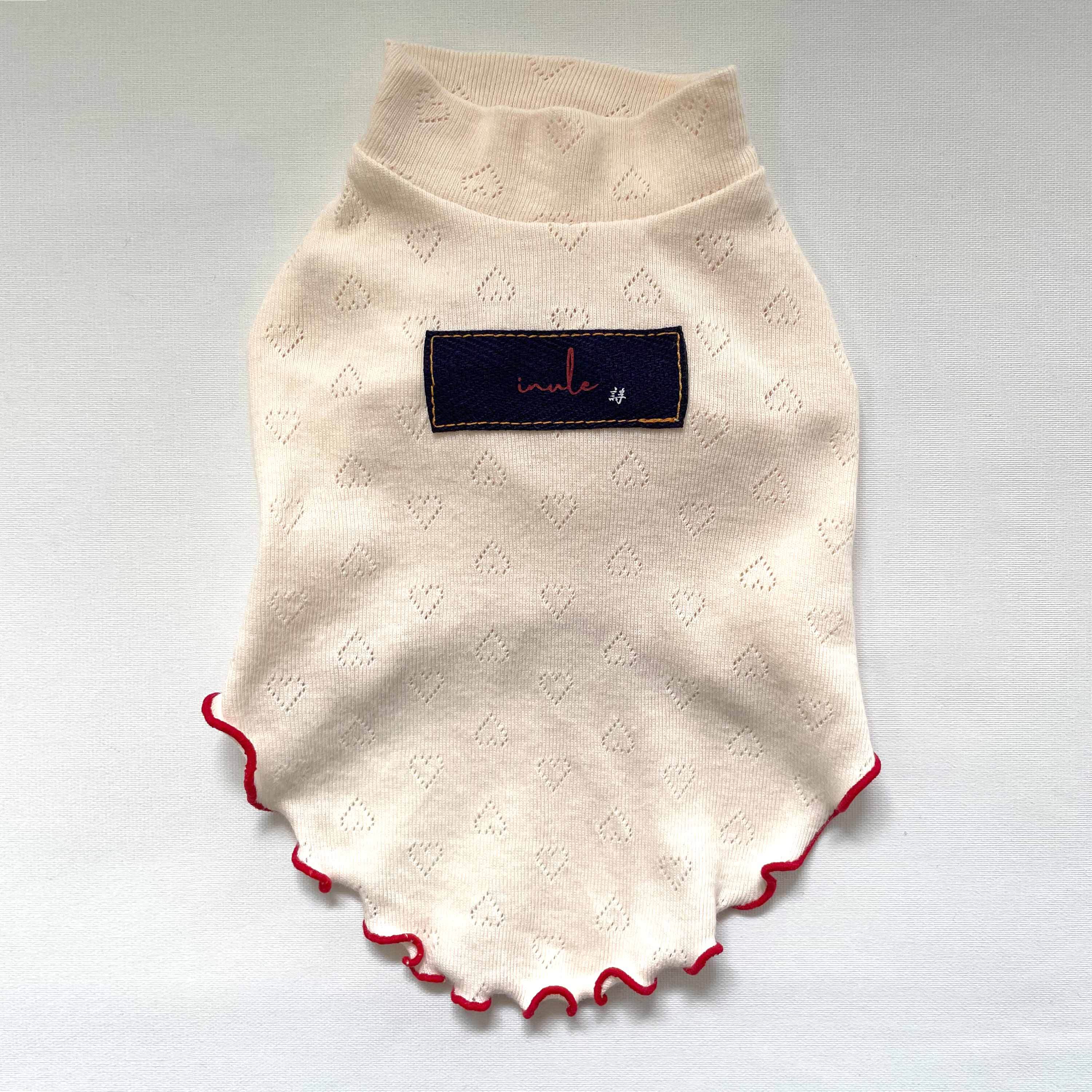 色も合わせやすいベイジュに赤のポイントカラー、ハイネックで薄手コットン、ハート形メッシュの生地ですので、オールシーズン着用可能です。