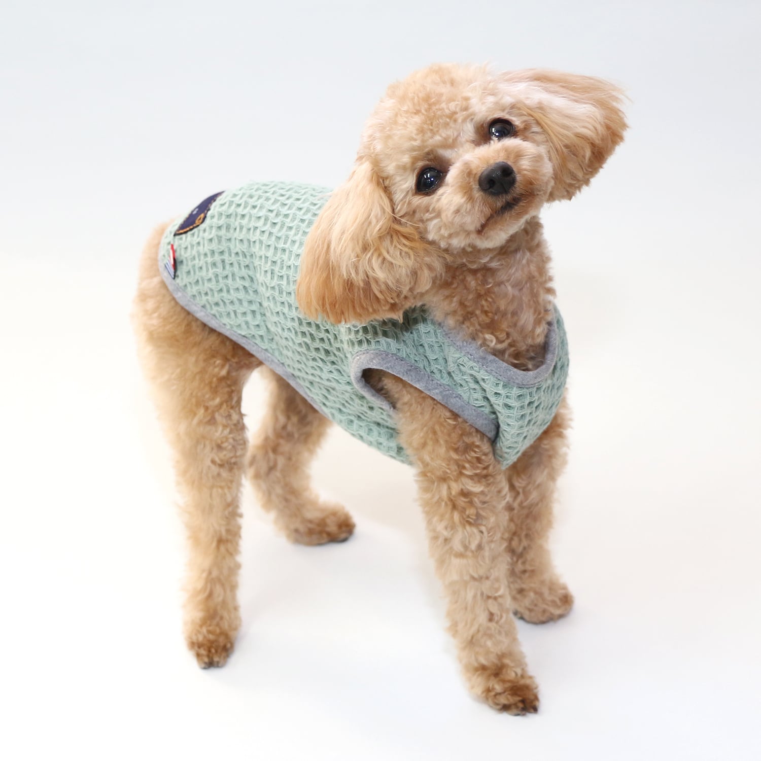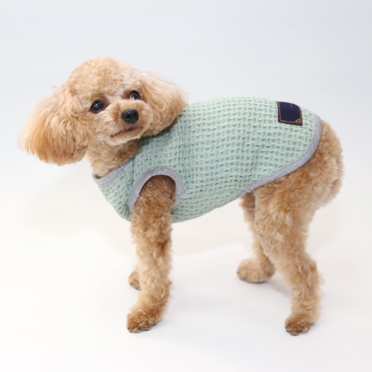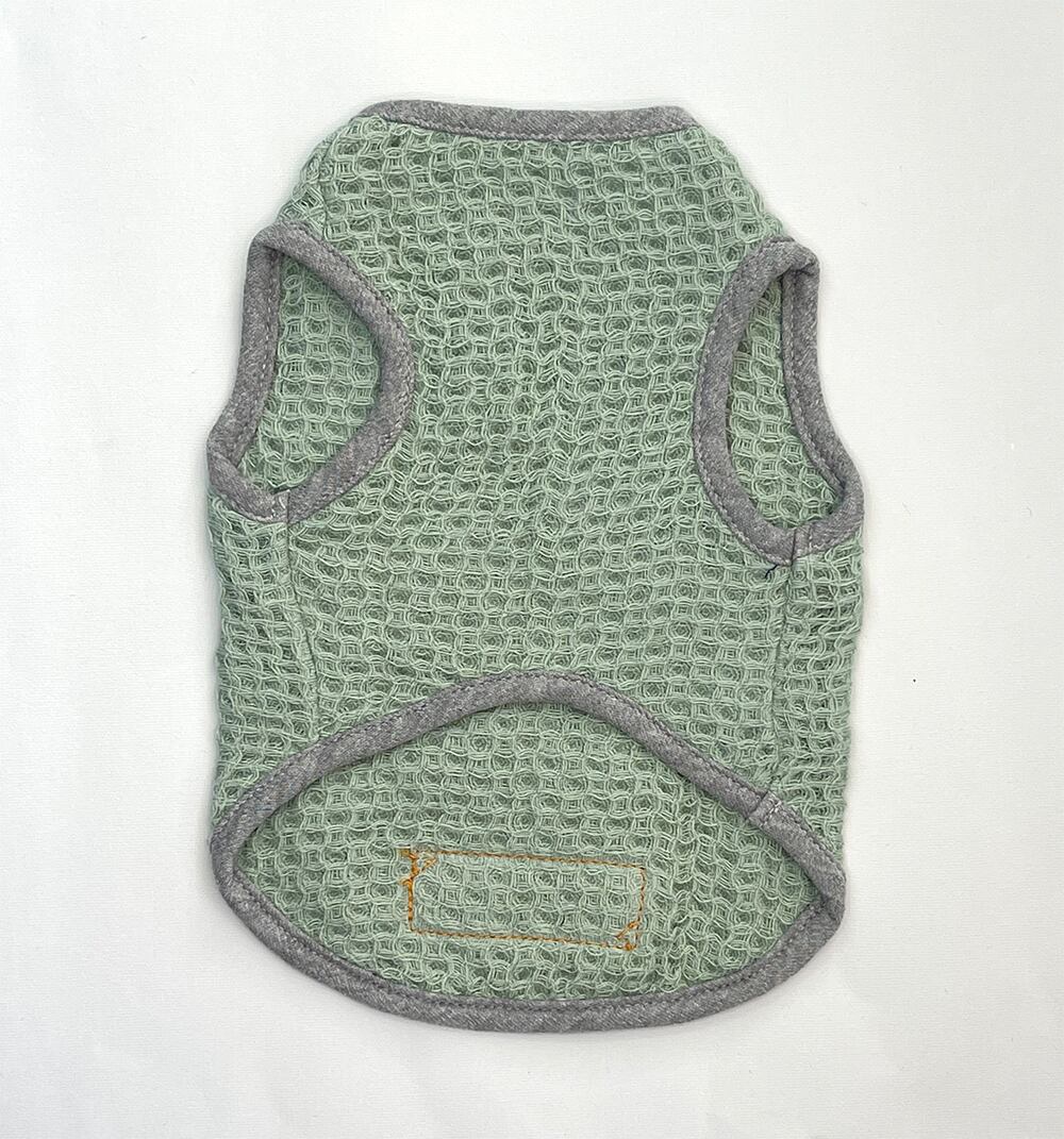 本来伸縮性のないタオル生地を独自のワッフル編みにする事で伸縮性を持たせ、脱着、運動時に愛犬にストレスを与える事がありません。